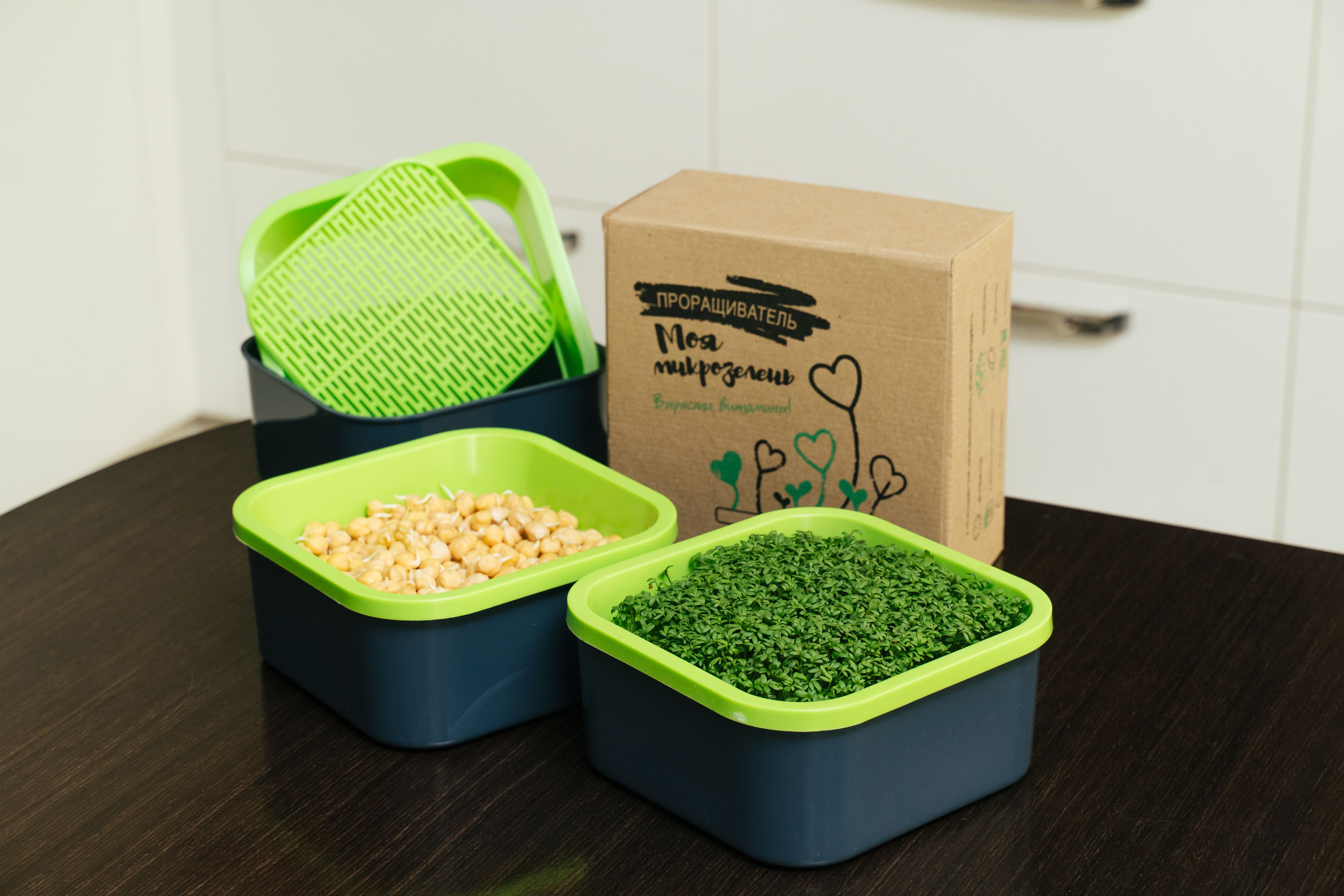 Каждый набор состоит из мини-контейнера с крышкой и подложкой для семян + пакетик с семенами. Это подходящий вариант для тех, кто только планирует заняться проращиванием.