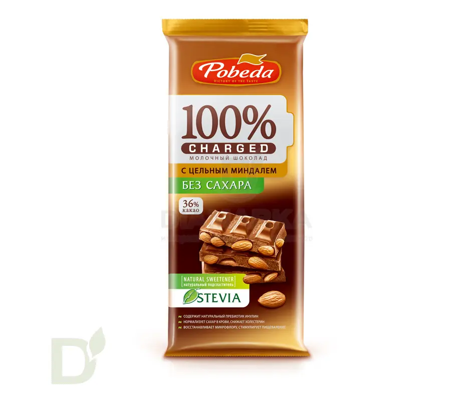 <h2>Настоящий шоколад без сахара на стевии</h2> Если вы хотя бы раз пробовали качественный, НАСТОЯЩИЙ шоколад, то наверняка навсегда запомнили этот яркий, насыщенный вкус?! Найти хороший шоколад в наше время ой как непросто: в большинстве плиток доминирует приторная сладость, а самого какао - кот наплакал.<br> <br> Кондитерская фабрика Победа позаботилась об истинных ценителях шоколада и создала продукт:<br> <ul> <li>в основе которого настоящие какао-продукты</li> <li> в котором нет сахара и лишних углеводов. За умеренную сладость отвечает натуральный подсластитель стевия</li> <li> в котором ДЕЙСТВИТЕЛЬНО МНОГО цельных орехов</li> </ul> <h2>В 100 граммах шоколада Победа ВСЕГО 34 углеводов</h2> Что очень мало, по сравнению с обычными плитками на сахаре!<br> <br> Масса нетто 90 грамм<br> <h2>Состав шоколада</h2> цельный миндаль, масло какао, тертое какао, сухое обезжиренное молоко, сыворотка молочная сухая, мальтит, инулин, лецитин соевый, экстракт стевии, натуральная ваниль<br> <h2>Энергетическая и пищевая ценность</h2> б - 15<br> ж - 41<br> у - 34<br> 570 ккал