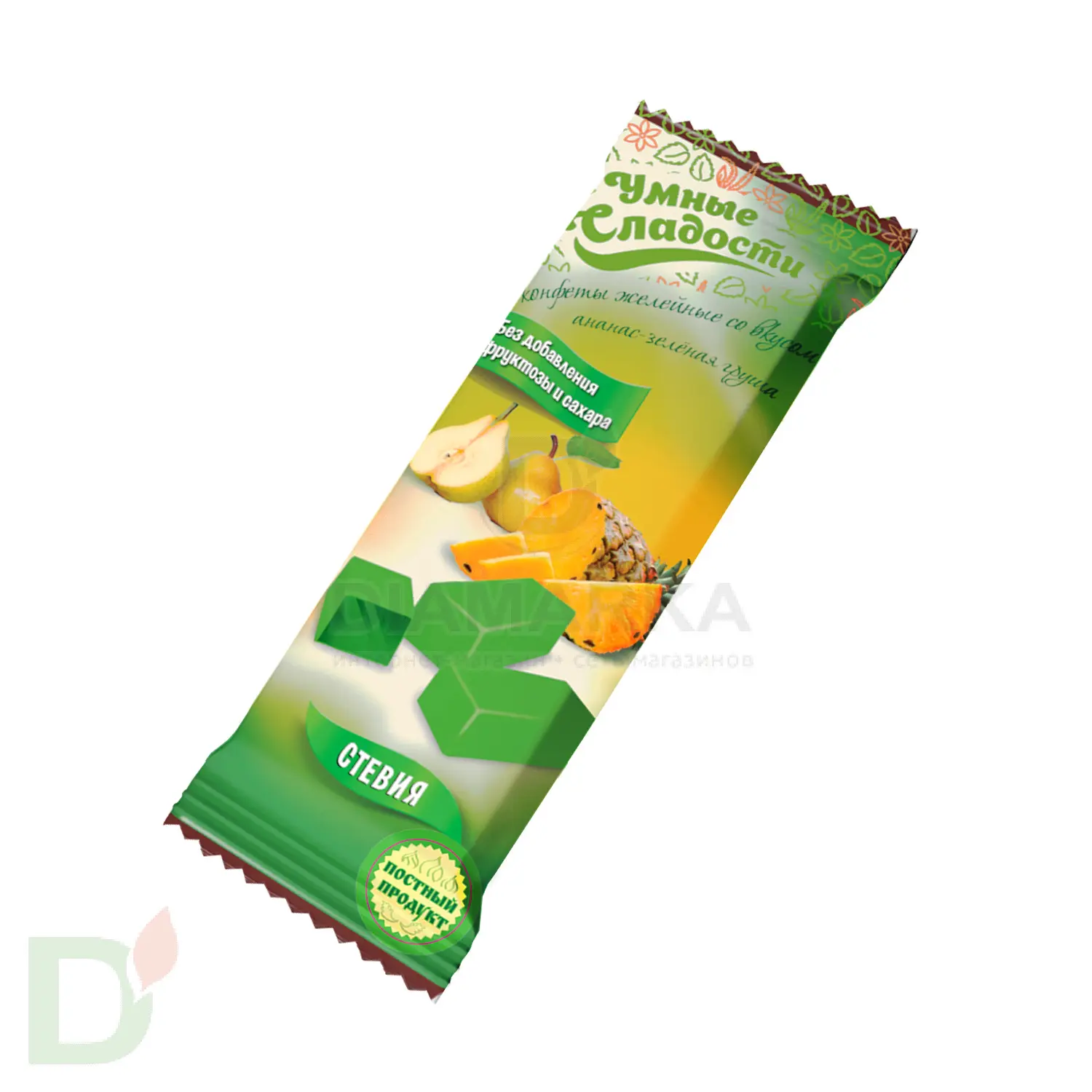 <h2>Правильные конфеты для правильных чаепитий</h2> Конфеты = сладость = много сахара. Такая установка сидит в голове у большинства людей. Хорошо, что мы живем в 21 веке и конфеты без сахара и его аналогов - вполне себе реальность, а не мечта!<br> <h2>Преимущества конфет без сахара</h2> <ul> <li>низкая скорость усвоения углеводов</li> <li> меньше калорий (в сравнении с обычными конфетами)</li> <li> не провоцируют развития кариеса</li> <li> ПРИ ЭТОМ по вкусу неотличимы от обычных конфет!</li> </ul> <h2>Что дает сладость</h2> Как было сказано выше, умные сладости не содержат сахара и его углеводных заменителей. Вместо них используются изомальт и стевия - природные низкокалорийные заменители, которые не оказывают на организм столь вредного воздействия, как сахар и аналоги.<br> <br> Масса: 90 грамм<br> <br> Срок годности 4 месяца<br> <h2>Состав конфет Ананас-груша</h2> патока, изомальт, загуститель-пектин, регулятор кислотности-кислота лимонная, влагоудерживающий агент-лактат натрия, ароматизатор «Ананас», «Зеленая груша», краситель пищевой, подсластитель-стевия.<br> <h2>КБЖУ на 100 грамм конфет</h2> 246 ккал<br> б - 0,4<br> ж - 0<br> у - 63,8