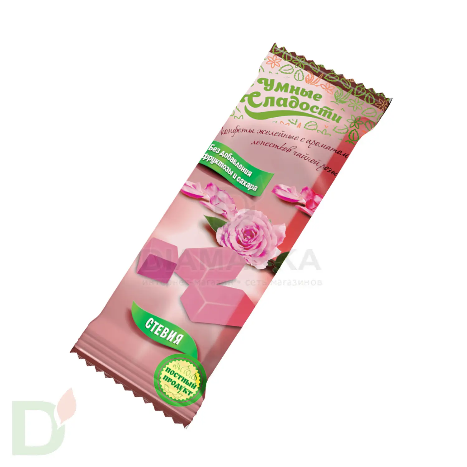 <h2>Правильные конфеты для правильных чаепитий</h2> Конфеты = сладость = много сахара. Такая установка сидит в голове у большинства людей. Хорошо, что мы живем в 21 веке и конфеты без сахара и его аналогов - вполне себе реальность, а не мечта!<br> <h2>Преимущества конфет без сахара</h2> <ul> <li>низкая скорость усвоения углеводов</li> <li> меньше калорий (в сравнении с обычными конфетами)</li> <li> не провоцируют развития кариеса</li> <li> ПРИ ЭТОМ по вкусу неотличимы от обычных конфет!</li> </ul> <h2>Что дает сладость</h2> Как было сказано выше, умные сладости не содержат сахара и его углеводных заменителей. Вместо них используются изомальт и стевия - природные низкокалорийные заменители, которые не оказывают на организм столь вредного воздействия, как сахар и аналоги.<br> <br> Масса: 90 грамм<br> <br> Срок годности 4 месяца<br> <h2>Состав конфет Чайная роза</h2> патока, изомальт, загуститель-пектин, регулятор кислотности-кислота лимонная, влагоудерживающий агент-лактат натрия, ароматизатор «Чайная роза», краситель пищевой, подсластитель-стевия.<br> <h2>КБЖУ на 100 грамм конфет</h2> 246 ккал<br> б - 0,4<br> ж - 0<br> у - 63,8
