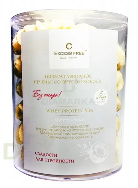 <p> <b>Печенье с 3 граммами углеводов на 100 грамм? Это не сказка, это - низкоуглеводное печенье ExcessFree!</b> </p> <h3> Эти печенья, пожалуй, чемпионы по своей диетичности</h3> <p>  Но не переживайте - вкус от этого не пострадал. </p> <h3>Мы рекомендуем низкоуглеводное печенье ExcessFree потому, что </h3> <p> </p> <ul> <li> <p> в составе нет муки и сахара </p> </li> <li> <p> содержит ничтожно малое количество углеводов и калорий </p> </li> <li> <p> обогащено пищевыми волокнами </p> </li> <li> <p> не содержит усилителей вкуса, консервантов, искусственных ароматизаторов </p> </li> <li> <p> можно есть без подколки инсулина, перед сном) </p> </li> </ul> <p> </p> <br> <p> <b>Состав:</b> натуральный подсластитель эритритол, белок яичный, растительные пищевые волокна, вода, ксантановая камедь, пищевой ароматизатор, натуральный консервант низин, собрат калия, изолят сывороточного протеина 95%, молочная кислота, экстракт стевии. </p> <p> <b>БЖУ на 100 грамм:</b> белки - 6,3 г, жиры - 0,6 г, углеводы - 3 г, пищевые волокна - 26 г., Ккал. - 97. </p> <p> <b>Вес нетто - 160 г </b> </p> <b> </b> <p> <b> Срок хранения - 90 суток с даты производства<br> <br> </b> </p> <h2> <span><b>Срок годности 29.05.21</b><br> </span> </h2> <br>