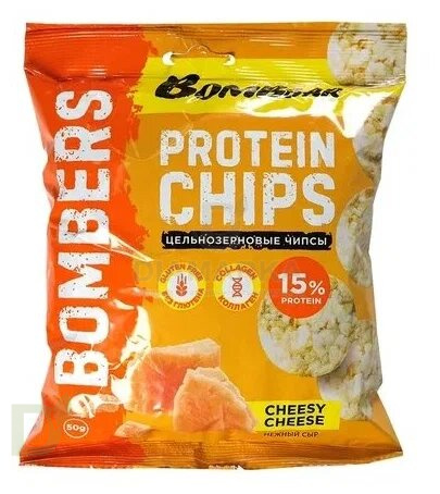 <h2>Хрустите чипсами без вреда для здоровья и фигуры</h2> Чипсы BOMBERS - это хрустящий цельнозерновой снек дополнительно обогащенный протеином и коллагеном. Идеален для вкусного, сытного и полезного перекуса. Чипсы не обжариваются, а запекаются, что позволяет при производстве использовать меньше масла, следовательно, калорийность продукта значительно снижается!<br> <br> <h3>Чипсы не содержат сахара, глютена и лишних жиров</h3> На пачку чипсов приходится ВСЕГО 2 грамма жира (в обычных чипсах его примерно в 15 раз больше) и на 40% меньше калорий. Продукт дополнительно обогащен коллагеном.<br> Полезные чипсы бывают, и Бобмерс тому доказательство.<br> <br> Масса нетто: 50 грамм<br> <h3>Состав чипсов BOMBERS с сыром</h3> крупа рисовая, крупа кукурузная, гороховый белок, вода, ароматизатор "Сыр Чеддер", соль, гидролизат коллагена, масло подсолнечное рафинированное дезодорированное.<br> <h4>КБЖУ на пачку чипсов</h4> б - 8<br> ж - 2<br> у - 26<br> пищевые волокна - 2<br> 152 ккал